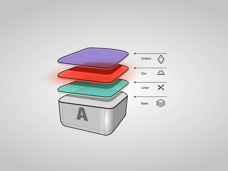 瀚海基因的“虚拟终止碱基”技术为合成测序过程提供更高的保真度和反应效率。这种类碱基在单个位置同时连接了终止结构和荧光标记,具有更加接近天然的酶反应活性位点。通过可精确单步控制的碱基延伸、合成终止、荧光激发过程之后,仅需一步切除,即可去除碱基修饰,允许下一轮的延伸和测序。