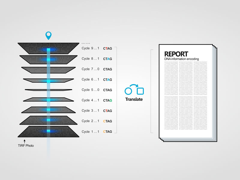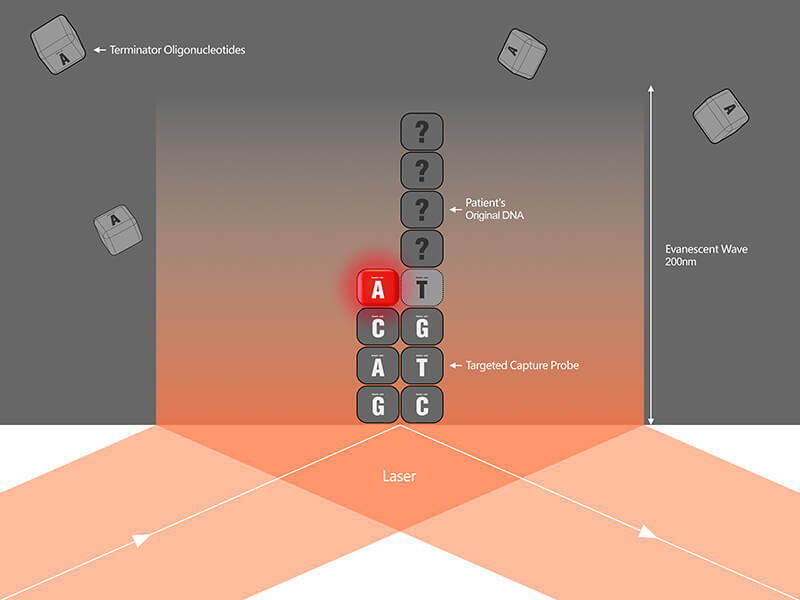 单分子荧光测序采用高灵敏度宽视野的全内反射荧光(TIRF——total internal reflection fluorescence)显微成像技术,可直接观测到极微弱的碱基单分子荧光信号。通过精心设计的TIRF照明系统在芯片表面产生倏逝波,仅允许芯片表面200nm深度以内的荧光分子被激发,消除了光路中的绝大多数背景噪声,因而能获得极佳的信噪比以识别出单个碱基信号。