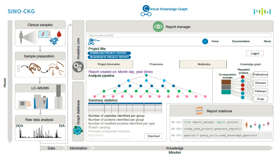 蛋白质组在过去的十年中已取得了长足的进步,为生物过程、细胞信号传导和蛋白质相互作用提供了越来越多的数据。然而,快速增长的数据量对该领域提出了新的挑战。高通量蛋白质组学中一个瓶颈是难以解释定量结果,对生物学或临床假设的验证提出了考验。因此,我们需要一种集成多种数据类型的解决方案,实现同时获取分子及其对应的疾病表型之间的关系。因此,建立一个基于知识的平台,将一系列数据库和科学文献信息与组学数据集成到易于使用的工作流程,将为发现科学和临床实践提供支持。中科普瑞根据国外技术文献和自有数据二次开发,建立了普鲸临床蛋白质组学数据知识图谱 (SINO Clinical Knowledge Graph,简称SINO-CKG,网址:https://ckg.olink-service.com: 28050),目前包含近 2000 万个节点和 2.2 亿个关系,并结合了统计和机器学习算法,可加速蛋白质组学工作流程的分析和知识挖掘。