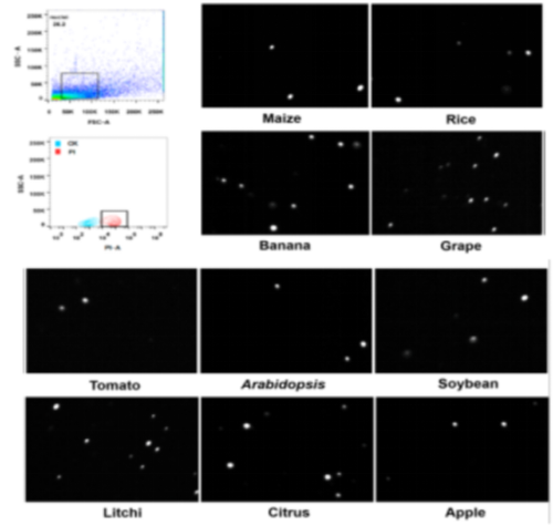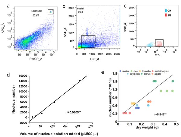 在发育及育性的研究中,细胞核计数是非常重要的测量指标,实验方案中使用BD Trucount计数管,可以对提取的细胞核精确计数,避免染色核漂洗带来的随机损失。比较了10种植物的细胞核绝对数量,并计算不同组组织与细胞核提取得率的关系,发现该细胞核计数方式稳定可靠,不同植物的细胞核得率与其干重有显著的相关性。
