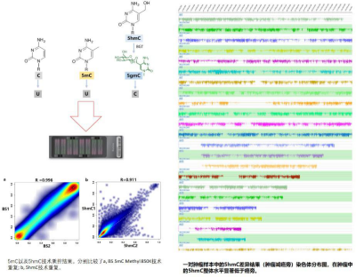 遗传密码除了ATCG四碱基之外,其中胞嘧啶C也因其嘧啶环第5倍碳原子的甲基化修饰,而携带表观遗传信息而被称为第5位碱基(5-甲基胞嘧啶,5mC)。DNA的甲基化修饰赋予了DNA双链除蛋白质编码信息外的表观遗传记忆,对基因组稳定性、基因表达和发育具有深远的影响。 随着DNA的去甲基化酶--DNA双加氧酶TET的发现,胞嘧啶甲基化修饰的氧化形式才渐渐进行人们的视野。5羟甲基化胞嘧啶(5hmC)是甲基化胞嘧啶最常见的氧化形式,不仅是5mC主动去甲基化的中间体,还是基因组中稳定存在的修饰形式,有着特异的结合蛋白,在调控胚胎发育、干细胞分化、神经系统的塑造及在肿瘤等复杂疾病中具有重要作用。